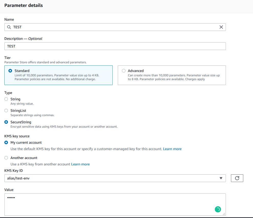 Note that parameters created by this module are prefixed with ${environment}/${application_name}/. In this example, the resulting parameter will therefore have the name: test/kattehotell/SvarUt/BaseUrl.
